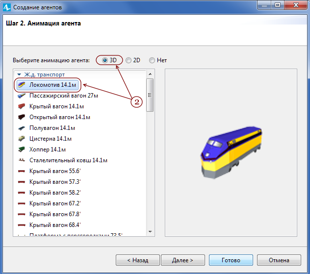 Выберите Locomotive 14.1m в качестве его фигуры анимации в 3D режиме.