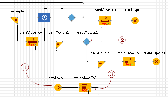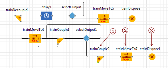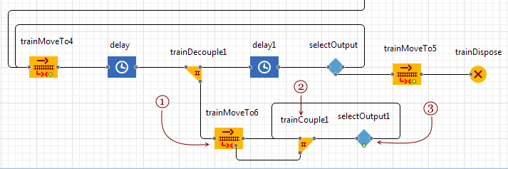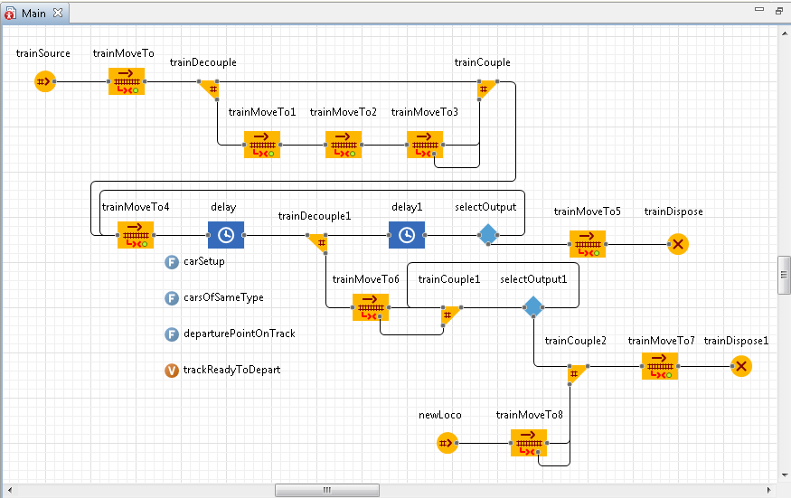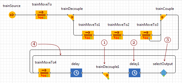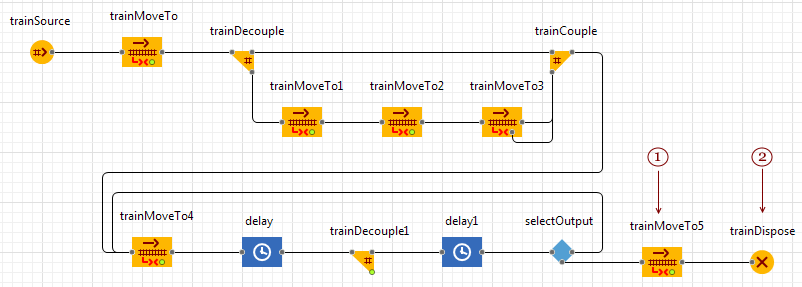 Движение, как обычно, моделируется блоком TrainMoveTo. Поезд содержит отдельные вагоны или сцепленные вагоны одного типа. Назначение задается функцией departurePointOnTrack, которую мы указали ранее.