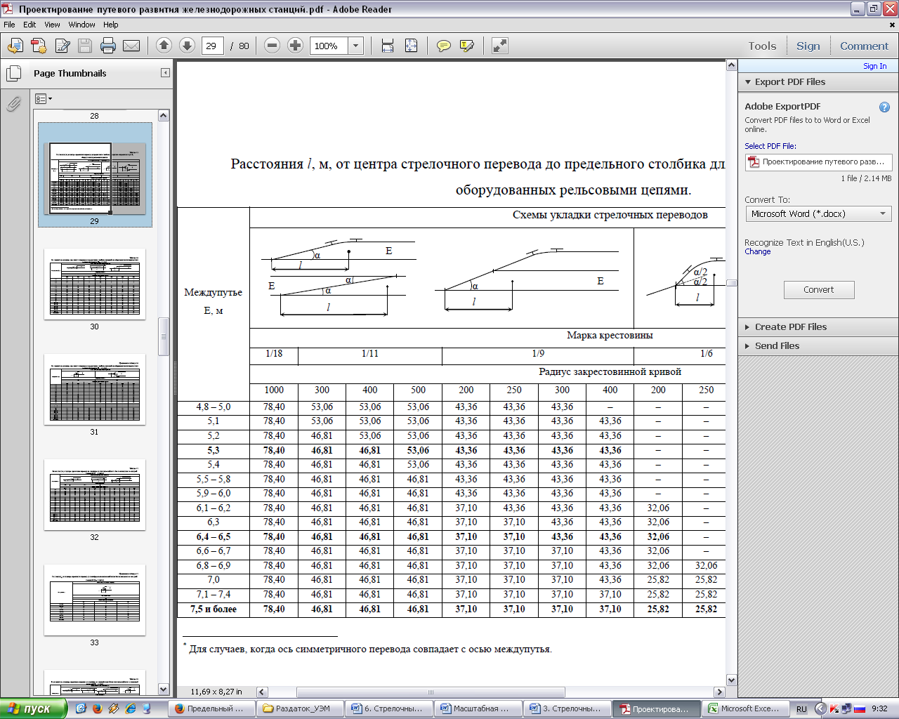 По формулам, приведенным в теоретической части, рассчитать длины прямых вставок и тангенсов кривых. Для марки крестовины 1/9 радиус закрестовинной кривой принимается равным 200 м, для 1/11 – 300 м, для 1/18 – 1000 м.
