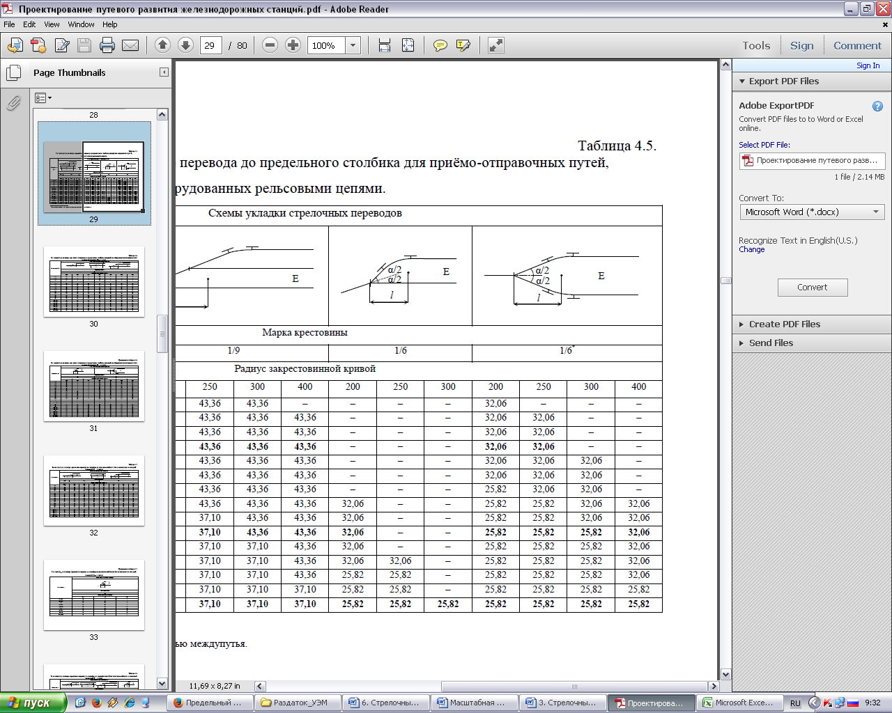 В четырех таблицах указать исходные данные, условные обозначения и все расчетные величины. В первую таблицу заносятся исходные данные по варианту; во вторую – координаты объектов (ЦП, ПС, ВУ); в третью – длины прямых вставок (d и f), размеры элементов стрелочных переводов (a и b), длины тангенсов кривых, расстояния между соседними стрелочными переводами; в четвертую – условные обозначения (Т, ЦП, ПС, ВУ, R).