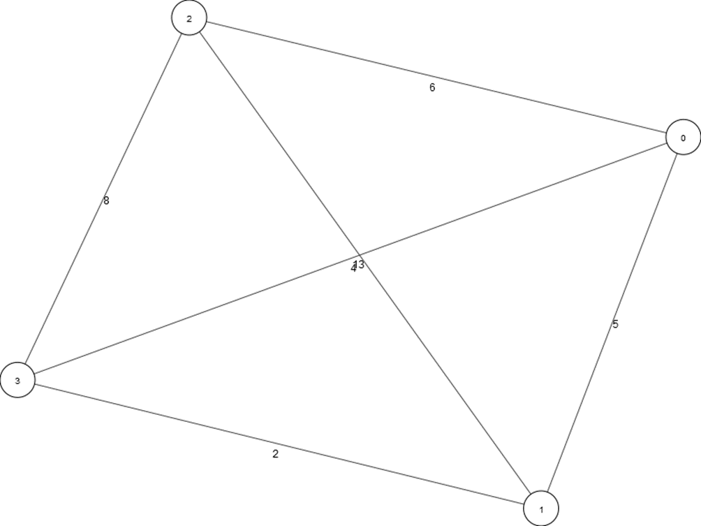 shortest_loops = branch_and_bound(0,matrix) print('Shortest loop(s) =', shortest_loops, '\nSum =', sum(matrix[k[i]][k[i+1]] for k in shortest_loops for i in range(len(k[:-1])))) print_graph(matrix) |