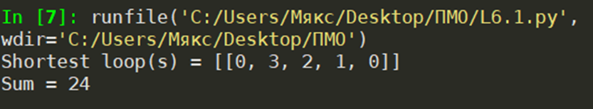В ходе выполнения лабораторной работы была изучена задача коммивояжера. Написав программу для решения задачи коммивояжера, убедились в правильности выполнения на основании результата.