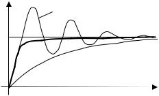 Например, в линейных системах существует известное противоречие между быстродействием и колебательностью. Увеличение быстродействия с помощью, скажем, повышения общего коэффициента усиления разомкнутой цепи приводит к большой (или недопустимой) колебательности. Можно, конечно, применить линейную коррекцию, которая позволит повысить верхний предел коэффициента усиления, но все же это не снимает противоречия между требованием повышения быстродействия и увеличения запаса устойчивости. На рис. 2.34 приведён пример двух переходных процессов в линейной системе (показаны пунктиром): 1 – с большим коэффициентом усиления, но с недопустимой колебательностью и 2 – с большим запасом устойчивости, но с малым быстродействием. Было бы замечательно реализовать такой переходной процесс, у которого начальный участок принадлежал первому процессу, а конечный