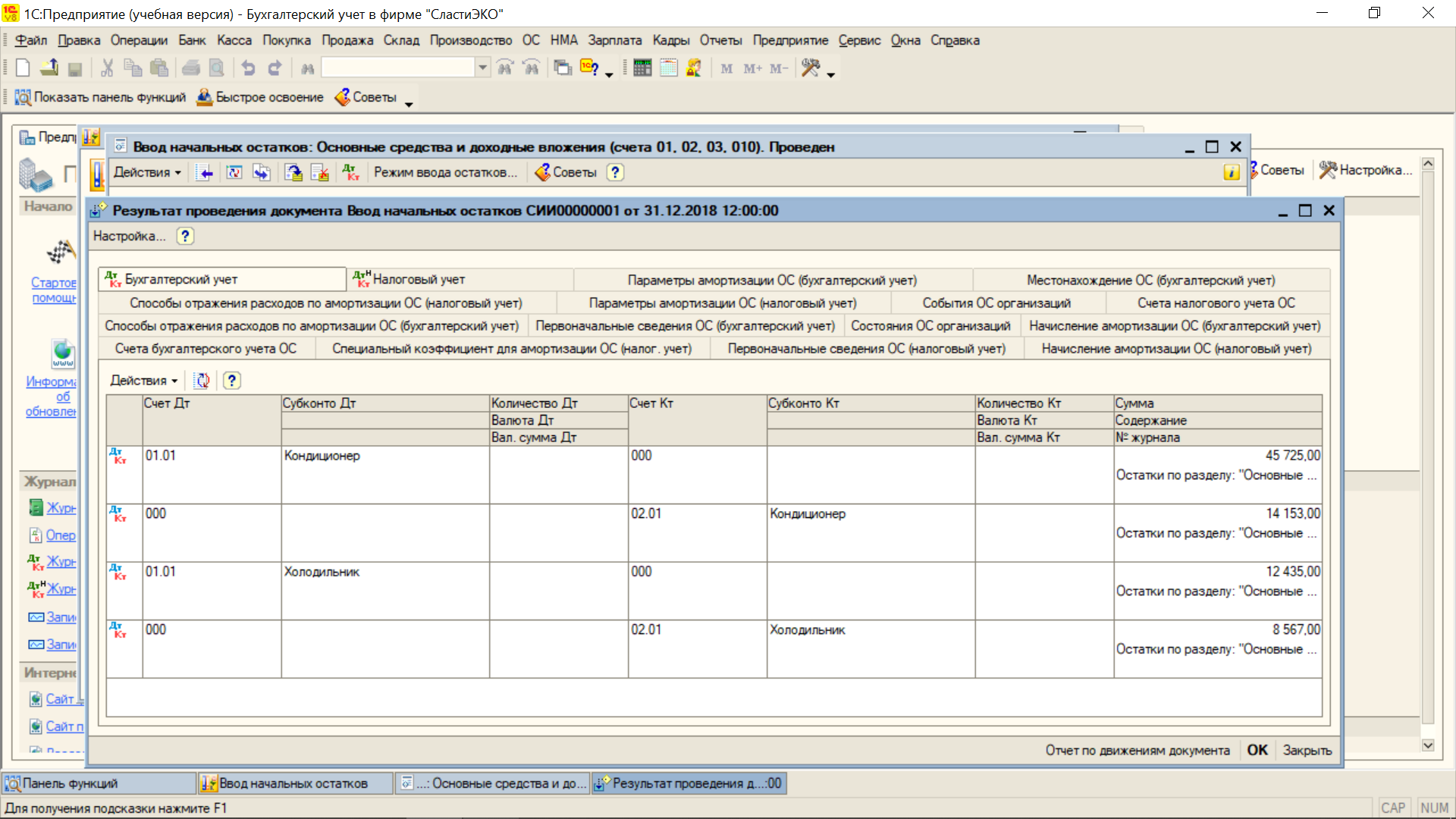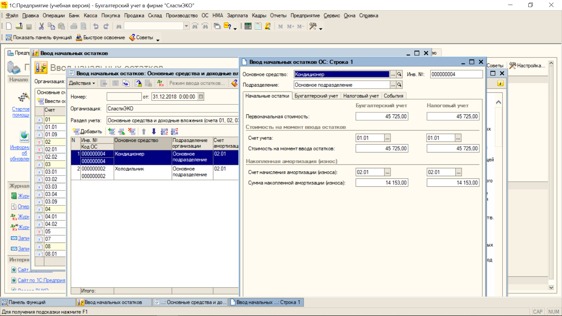 4. Ввод начальных остатков по ОС для объекта «Кондиционер».