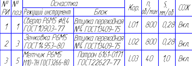 Технологічна оснастка: пристосування спеціальне; свердло Р6М5 8,4 ГОСТ10903-77; мітчик Р6М5 М10-7Н ГОСТ3266-80; Зенківки Р6М5 ГОСТ14953-80; калібр-пробка М10-7Н ПР ГОСТ17756-82; калібр-пробка М10-7Н НЕ ГОСТ17756-82.
