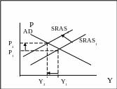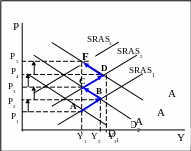Предположим, что центральный банк увеличил предложение денег, что ведет к росту совокупного спроса. Кривая совокупного спроса AD1 сдвигается вправо до AD2. В результате уровень цен увеличивается с Р1 до Р2, а поскольку ставка заработной платы остается прежней, то реальные доходы падают. Рабочие требуют повышения ставки заработной платы пропорционально росту уровня цен. Это увеличивает издержки фирм и приводит к сдвигу кривой совокупного предложения SRAS1 влево-вверх до SRAS2. Уровень цен при этом повысится до Р3. Реальные доходы снова снизятся. Рабочие снова начнут требовать повышения номинальной заработной платы. Рост заработной платы приводит к росту потребительских расходов. Совокупные расходы растут, кривая совокупного спроса сдвигается вправо до AD3, уровень цен возрастает до Р4.