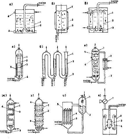 а – Ферментер барботажний Н0/D≤2: 1 – корпус, 2 – повітрярозподілювач, 3 – карман, 4 – колектор; б – Ферментер барботажний колонний 2<H0/D<10: 1 – корпус, 2 – сорочка, 3 – повітрярозподілювач; в – Ферментер барботажний ерліфтний Ho/D<2: 1 – корпус, 2 – дифузор-теплообмінник, 3 – повітрярозподілювач; г – Ферментер газліфтний колонний 2<H0/D<10: 1 – корпус, 2 – дифузор, 3 – диспергатор, 4 – повітрярозподілювач, 5 – теплообмінник; д – Ферментер газліфтий петльовий колонний: 1 – корпус, 2 – дифузор, 3 – повітряпровідний патрубок; е – Ферментер газліфтний рециркуляційний колонний: 1 – піногасник, 2 – теплообмінник, 3 – циркуляційна труба, 4 – диспергатор, 5 – корпус; ж – Ферментер тарілчастий колонний: 1 – корпус, 2 – тарілка, 3 – повітряпровідна труба, 4 – переливна труба; 3 – Ферментер з плаваючою на-