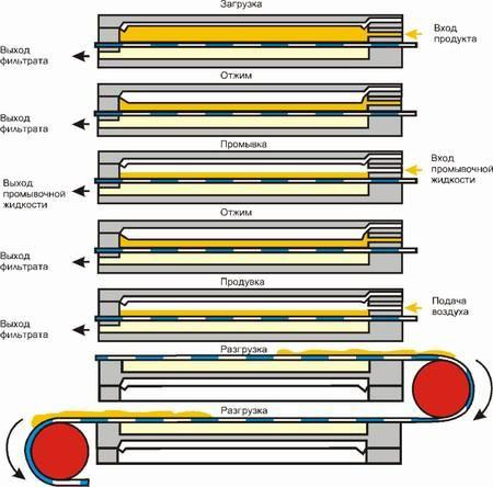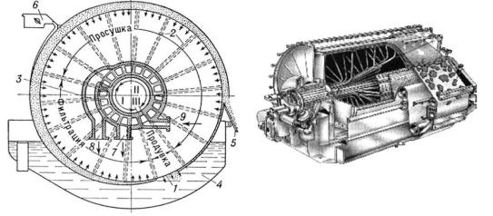 фільтруючою тканиною, а сам барабан роздільний перегородками на секції. При його обертанні секції послідовно підключаються до збірок фільтрату, промивних вод і до колектора стислого повітря.
