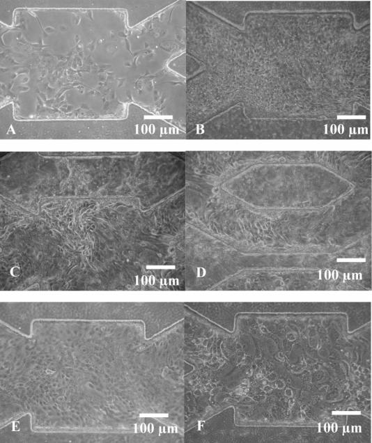 Figure 1. Morphological observations of the MDCK inside the cellular microchip using a 10 íL/min flow rate: (A) after seeding and 12 h at rest, the cells successfully attached to the surface; (B) after 24 h of perfusion, corresponding to 36 h of culture the cell proliferate to create a confluent monolayer; (C,D) after 72 h of perfusion, corresponding to 96 h of culture, the cells grow over the microstructures to create ª3D-like tissueº ; (E) after 72 h of perfusion with 5 mM of ammonium chloride, cells do not spread over the microstructures; (F) after 72 h of perfusion with 10 mM of ammonium chloride, cells appear bigger than in other culture conditions.