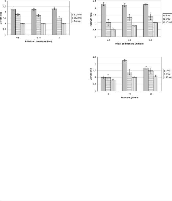 The cell proliferation was not affected by the initial cell density for the tested cases (5 to 10 105 cells/microchip), as demonstrated for three cases by Figure 2. In all static cases (inside the microchips flow rate was 0 íL/min), the cell number remained similar between the beginning and the end of the cultures. When there was no applied flow, the cells did not proliferate. On the contrary, for flows of 10 íL/min, initial cell density multiplied roughly by 2.2 ( 0.1, and at 25 íL/min, the population increased by 1.7 ( 0.2, as shown by the Figure 2. The measured glucose consumption, which corresponds to the cell metabolism, was about 16 ( 2 íg/h/106 cells at a flow rate of 10 íL/min and 35 ( 5 íg/h/106 cells at 25 íL/min (Table 2). The maximum cell density achieved in the microchip was 6.6 107 cells/cm3 at 10 íL/min and 4.6 107 cells/cm3 at 25 íL/min (corresponding to 2.3 106 and 1.6 106 cells/ microchip, respectively). LDH levels were very low, demonstrating healthy culture conditions (Table 2). Ammonia production was found higher at 25 íL/min, with a production of 1.4 ( 0.3 ímol/day/106 cells when compared to 0.8 ( 0.4 ímol/ day/106 cells at 10 íL/min (Table 2).