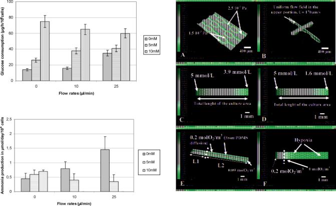 Figure 7. Results of the numerical simulations inside the microchip at 10 íL/min: (A) shear stress contours; (B) velocity profiles; (C) glucose consumption along the microchip based on the data measured and reported in Figure 6; (D) glucose consumption when 10 mM ammonium chloride is added to the culture medium, based on the data measured and reported in Figure 6; (E) oxygen consumption inside the cellular microchip taken into account diffusion through the PDMS;