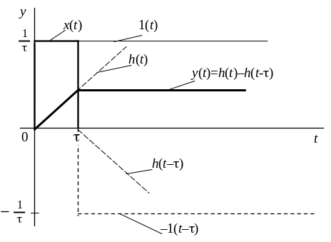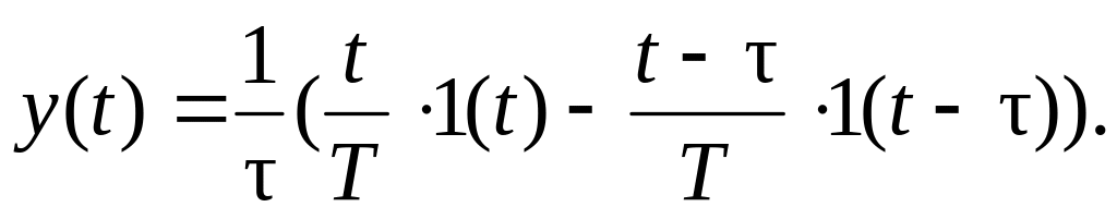 Выходной сигнал интегрирующего звена, при подаче на вход единичного прямоугольного импульса, равен разности двух переходных характеристик.