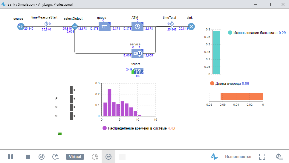 Запустите модель. Включите режим виртуального времени и понаблюдайте за тем, какой вид примет распределение времен пребывания клиентов в системе.