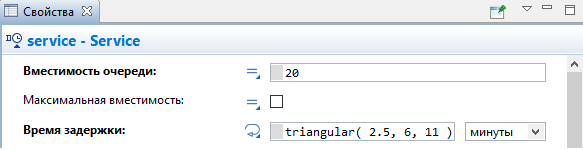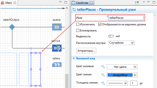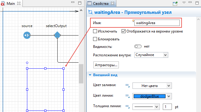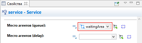 Выберите только что нарисованный нами узел waitingArea в параметре Место агентов (queue)