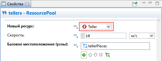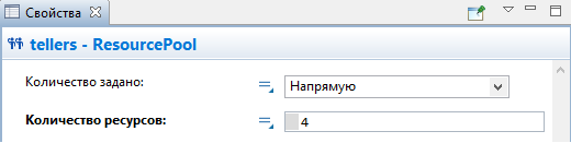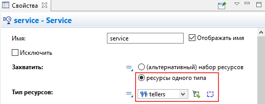 Выделите блок service и перейдите в панель Свойства. Выберите опцию Ресурсы одного типа в параметре Захватить ресурсы. Затем укажите блок tellers, который мы добавили на диаграмму, в параметре Блок ResourcePool. Вы можете выбрать его из выпадающего списка подходящих объектов, щелкнув стрелку "вниз", или выбрать фигуру из графического редактора, предварительно щелкнув кнопку справа от параметра (в таком случае все неподходящие объекты в графическом редакторе будут обесцвечены).