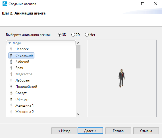 Выберите опцию 3D для типа анимации и фигуру анимации Служащий из списка 3D фигур.