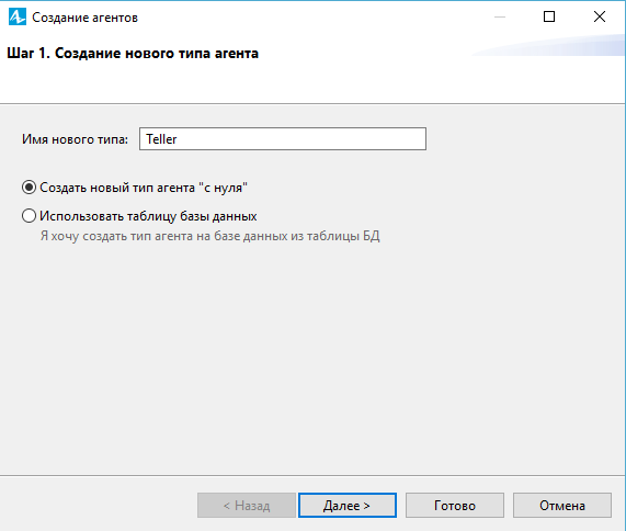 Откроется диалоговое окно Мастера создания агентов на шаге Создание нового типа агента. Введите Teller в поле Имя нового типа, оставьте опцию Создать новый тип агента "с нуля" выбранной. Нажмите Далее.