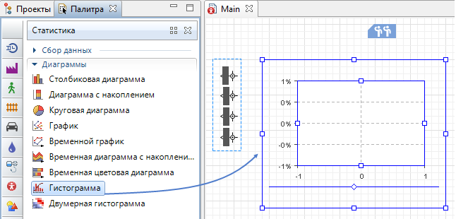 1.Чтобы добавить гистограмму на диаграмму агента, перетащите элемент Гистограмма из палитры Статистика в графический редактор. Измените ее размер.