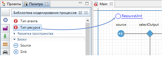 Откройте Библиотеку моделирования процессов в панели Палитра и перетащите блок ResourcePool на диаграмму агента Main. Объект ResourcePool задает ресурсы определенного типа (в нашей модели это будут банковские клерки).
