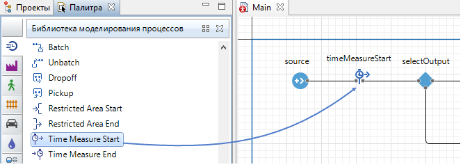 Откройте Библиотеку моделирования процессов в панели Палитра и добавьте блок TimeMeasureStart в освободившееся место. Убедитесь, что порты блока соединены к соседним блокам.