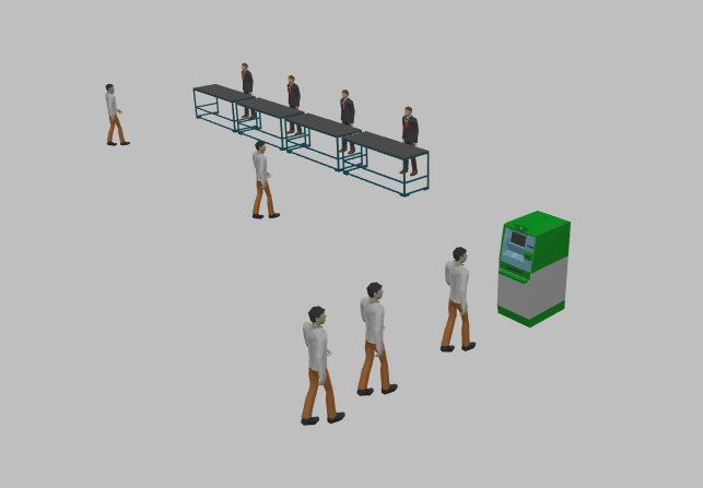 Теперь вы можете запустить модель и увидеть в 3D анимации, как некоторые клиенты идут к банкомату, а другие обслуживаются у столов клерков.