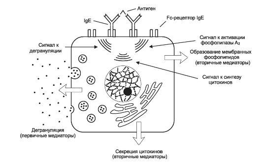 Рис. 16-1. Активация и дегрануляция тучных клеток при анафилактических реакциях (тип I гиперчувствительности по Джеллу и Кумбсу