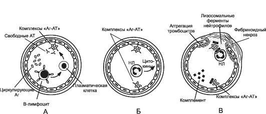 Стадия клинических проявлений является следствием прямого действия иммунных комплексов на клетки и ткани, а также эффектов медиаторов аллергии и фагоцитоза. Этот тип аллергической реакции является ключевым звеном патогенеза сывороточной болезни, мембранозного гломерулонефрита, альвеолитов, васкулитов, узелковых периартериитов, феномена Артюса и др.