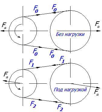 F0 , F1 и F2 - сила начального натяжения ремня, ведущей и ведомой ветвей под нагрузкой;
