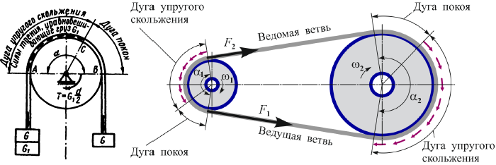 Окружная скорость каждого шкива равна скорости набегающей ветви ремня. По мере роста нагрузки на передачу дуга скольжения растет, когда она достигает всей дуги охвата, начинается буксование передачи. При круговом движении ремня на него действует центробежная сила Fv=ρSv2,
