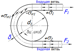 При этом напряжения изгиба не влияют на тяговую способность передачи, однако являются главной причиной усталостного разрушения ремня. Эти напряжения (рис.) используют в расчетах ремня на долговечность, так как при работе передачи в ремне возникают значительные циклические напряжения изгиба и в меньшей мере циклические напряжения растяжения из-за разности натяжения ведущей и ведомой ветвей ремня.