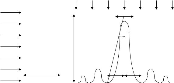 где k= 1, 2, 3,…, (N–1), (N+1),…, т. е. k может принимать все целочисленные значения, кроме 0, N, 2N,…, т. е. кроме тех, при которых условие (10) переходит в условие (9). Таким образом, в случае N щелей между двумя соседними главными максимумами располагается (N–1) добавочных минимумов, разделённых добавочными максимумами, интенсивность которых очень мала (рис. 5) и которые наблюдаются в направлениях, удовлетворяющих условию
