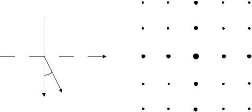 Выражения (21) и (22) позволяют при известных dx, dy, определить углы , , , характеризующие направление дифрагированного луча для максимумов того или иного порядка. Если в каждой решётке число щелей Nx и Ny достаточно велико, то максимумы будут очень острыми и в них сосредоточится практически вся световая энергия дифрагированных волн. В результате на экране, расположенном за двумерной решёткой, получится дифракционная картина в виде чётких, симметрично расположенных световых пятен, каждому из которых соответствуют два целочисленных индекса: kx и ky (рис. 7, б).