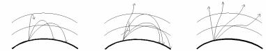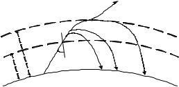 Ïðè f fmax условие отражения не выполняется для всех реальных углов падения ( m ) и волна проходит через ионосферный слой, испытывая в нем искривление траектории, т.е. преломляется (рис. 5.5,â). Наибольшее искривление испытывают пологие лучи, вертикальный луч не искривляется. Этому соответствует зависимость радиуса кривизны от угла падения в формуле (5.21). Такие траектории характерны для диапазона УКВ. С увеличением частоты искривление траектории волны уменьшается.