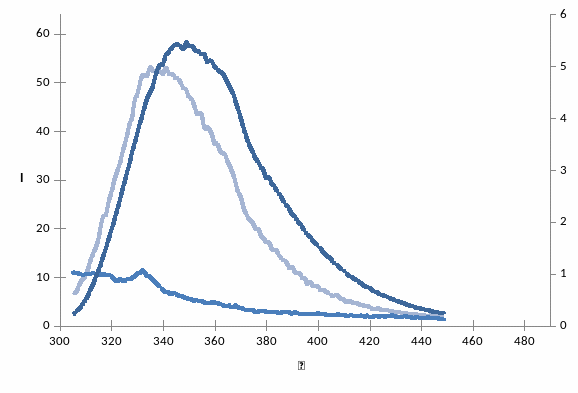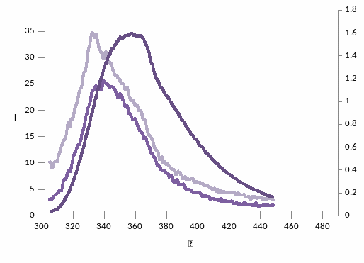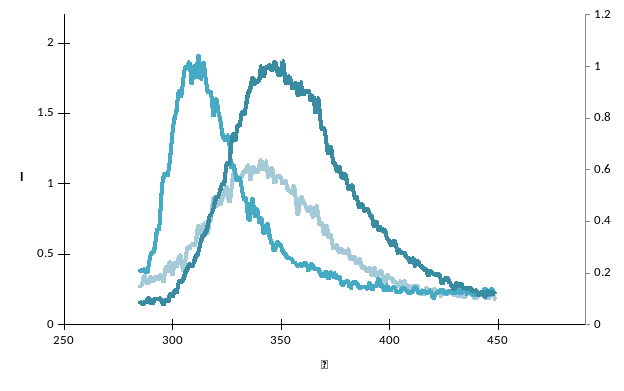 При уменьшении полярности растворителя λmax в спектре флуоресценции триптофана смещается в область более коротких длин волн и интенсивность при λmax возрастает: