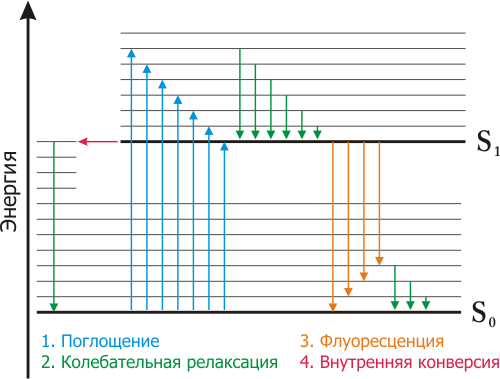 Поглощение и испускание света хорошо иллюстрирует диаграмма уровней энергии, предложенная Яблонским. Основное, первое и второе электронные состояния обозначают S0, S, и S2 соответственно. Каждый из этих уровней энергии может состоять из множества колебательных энергетических уровней, обозначаемых 0, 1, 2 и т. д. Переходы между различными электронными уровнями обозначают вертикальными линиями. Такое представление используется, чтобы наглядно показать мгновенную природу поглощения света. Этот процесс происходит примерно за 10-15 с, время, слишком короткое для заметного смещения ядер (принцип Франка - Кондона). Из-за большой разности энергий между уровнями S0 и S1 ни у каких флуорофоров состояние S1 не может быть заселено термическим путем. За поглощением света обычно следует несколько других процессов. Возбуждение флуорофора, как правило, происходит до некоторого высшего колебательного уровня состояний (S1 либо S2). За некоторыми редкими исключениями, для молекул в конденсированной фазе характерна быстрая релаксация на самый нижний колебательный уровень состояния S1. Этот процесс называется внутренней конверсией и происходит большей частью за 10-12 с. Поскольку типичные времена затухания флуоресценции близки к 10-8 с, внутренняя конверсия обычно полностью заканчивается до процесса испускания. Следовательно, испускание флуоресценции чаще всего осуществляется из термически равновесного возбужденного состояния. Термическое равновесие достигается за время порядка 10-12 с. Молекулы в состоянии S1 могут также подвергаться конверсии в первое триплетное состояние Т1. Испускание из Т1 (фосфоресценция), обычно сдвинуто в сторону больших длин волн по сравнению с флуоресценцией. Переход из S1 в Т1 называется интеркомбинационной конверсией.