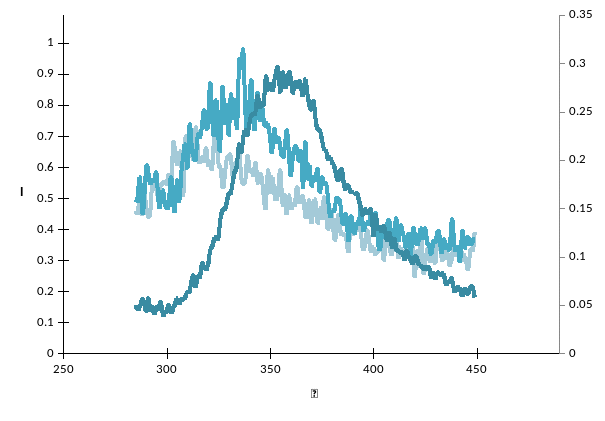 Триптофан проявил pH зависимость. Возможно, это происходит ввиду повышения диссоциации фенольного кольца, ввиду чего произошло перераспределение зарядов на молекуле, что повлекло за собой уменьшение флуоресцентных свойств. В случае с БСА также наблюдается pH зависимость. Это может быть объяснено чувствительностью триптофана к pH т.к. именно флуоресценция триптофана оказывает основное влияние на флуоресцентные свойства белка.