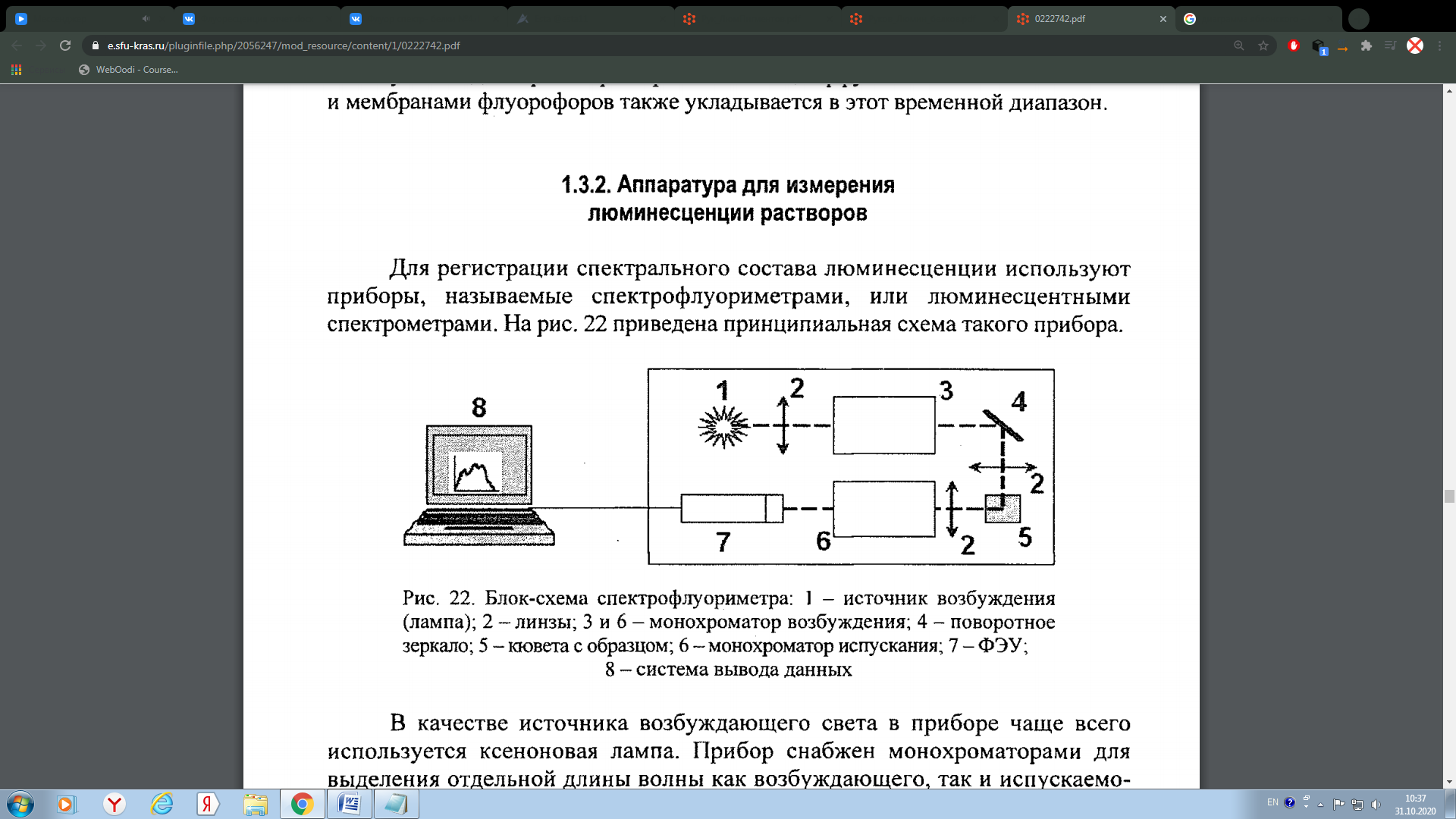 Измерение флуоресценции исследуемых растворов осуществляется с помощью спектрофлуориметра. Прибор снабжён монохроматорами для выделения отдельной длины волны как возбуждающего, так и испускаемого света. Флуоресценция попадает на фотоумножители и затем количественно измеряется с помощью соответствующих электронных устройств. Схема использованной установки представлена на рисунке 2.