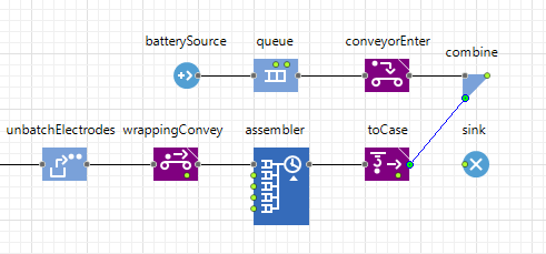 Теперь функция unblock() блока hold будет вызываться каждый раз, когда корпус аккумулятора поступает на конвейер, где кран должен поместить в него группу электродов. В оставшееся время движение групп электродов будет заблокировано.