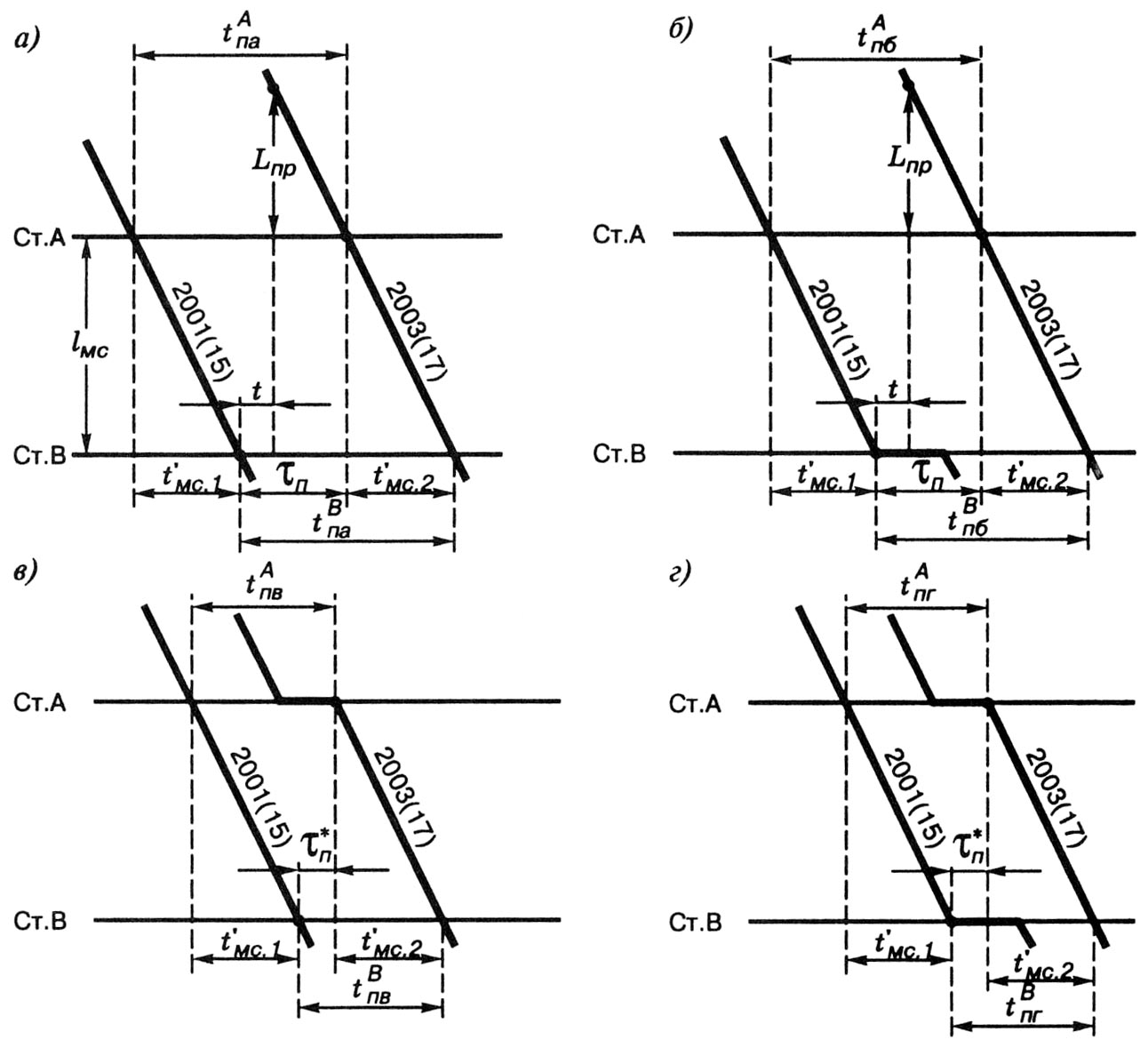 а – проследование без остановки первого поезда (№ 2001 либо № 15) по второму раздельному пункту (ст. В) и проследование без остановки второго поезда (№ 2003 либо № 17) по первому раздельному пункту (ст. А);