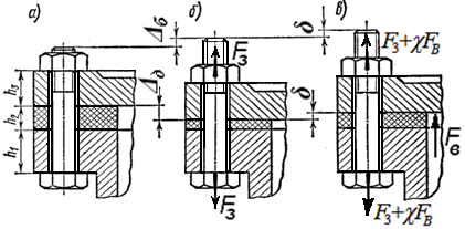 Рассмотрим резьбовое соединение (рис.,а), затянутое силой FЗ и затем нагруженное силой FВ вдоль оси болта (рис., б, в). Определим силу, действующую на болт. При затяжке гайка получает осевое перемещение Δб. При этом происходит сжатие Δд стягиваемых деталей и растяжение Δб болта (см. рис., а и б). Под действием внешней силы FВ дополнительно происходит удлинение δ болта (см. рис., в), при этом начальное сжатие Δд деталей уменьшится также на величину δ (см. рис., б и в).
