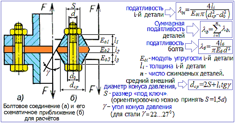 1. В затянутом соединении внешняя нагрузка передается на болт лишь частично; следовательно, затяжка является эффективным средством повышения долговечности соединения;