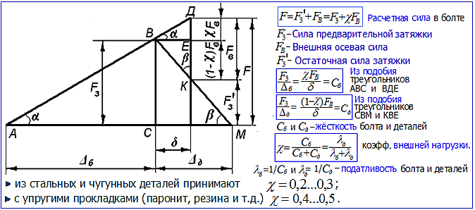 Для наглядности используем диаграмму сил (рис). Кривые деформирования (прямые, при упругом нагружении) болта и деталей показаны на диаграмме в виде лучей. Они описывают зависимости сил в болте и деталях, от их удлинения при растяжении (укорочения при сжатии).