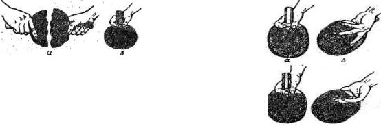 котором ручка ракетки направлена вверх и ось ракетки проходит перпендикулярно. Большой и указательный пальцы обхватывают ручку ракетки так, как держат авторучку, остальные три пальца удобно располагаются на тыльной стороне ракетки веером или накладываются один на другой («клещи» – рис. 3, а; «веер» – рис. 3, б; «кольцо» – рис. 3, в; согнутые, свободно лежащие – рис. 3, г).