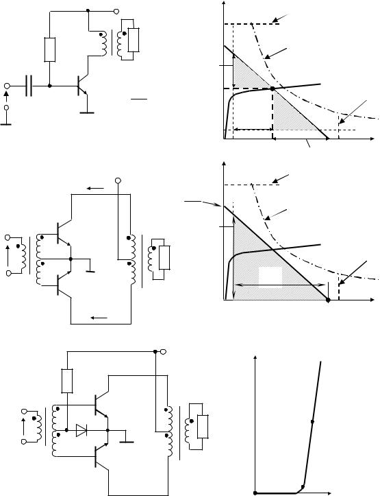 коя (при Uвх = 0) транзисторы VT1 и VT2 закрыты, так как по постоянному току их эмиттерные переходы закорочены активным сопротивлением вторичных обмоток трансформатора TV1. Рабочая точка В находится в начале координат входной характеристики транзистора (рис. 10.1, в), токи базы и коллектора транзисторов VT1 и VT2 равны нулю. К транзисторам прикладывается все напряжение источника питания (UКЭ = Е на выходных характеристиках).