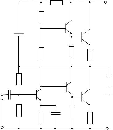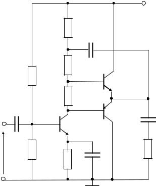 При большой величине мощности, отдаваемой в нагрузку (единицы–десятки ватт), для уменьшения тока покоя VT1 в двухтактном выходном каскаде применяют составные транзисторы, причем оконечные транзисторы берут однотипными с целью их унификации (рис. 10.6). Такие схемы каскадов называют схемами с квазидополнительной симметрией. Здесь транзисторы VT2, VT4 образуют составной эмиттерный повторитель (ОК-ОК), а транзисторы VT3, VT5 – двухкаскадный усилитель ОЭ-ОЭ со стопроцентной последовательной ООС по напряжению, также неинвер-