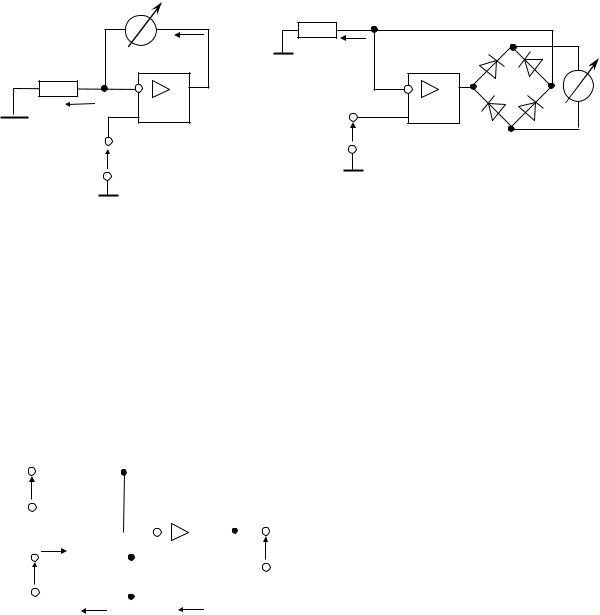 Применение операционных усилителей (рис. 12.12) позволяет существенно уменьшить перечисленные погрешности и построить милли-вольтметры постоянного и переменного напряжения. Применение неинвертирующего включения ОУ обеспечивает большое входное сопротивление измерительной цепи. Поэтому при ее подключении величина Uвх не изменяется. Так как разность потенциалов между входами ОУ практически равна нулю,