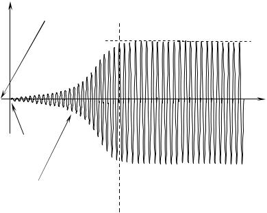 На рис. 14.2 представлены три этапа работы автогенератора, начиная с момента его запуска и до установления в нем стационарной амплитуды колебаний. До момента пуска (автогенератор выключен) ни одно из условий (или хотя бы одно из них) не выполнено и автогенератор не работает. С момента пуска условия баланса амплитуд и фаз выполнены: Т >1, φк + φос = 2πn и в автогенераторе возникают и нарастают колебания от Uвых = 0 до Uвых= Аг. Следует подчеркнуть, что на этапе установления колебаний уравнение баланса амплитуд автогенератора превращается в неравенство Т>1 и время нарастания колебаний до стационарного уровня будет тем меньше, чем сильнее это неравенство.