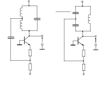 В генераторах, собранных по схемам индуктивной (рис. 14.5, а) и емкостной (рис. 14.5, б) трехточки, транзистор VT1 включен по схеме c общей базой. Напряжение обратной связи, снимаемое с индуктивного или емкостного делителя, имеет ту же фазу, что и коллекторное напряжение. Необходимая величина коллекторного тока задается источником отрицательного смеще-