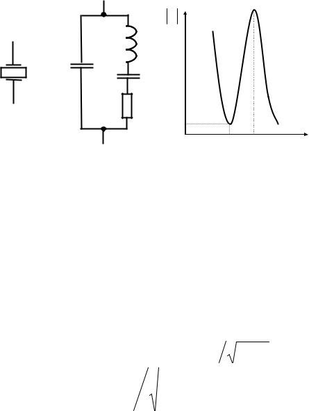 Рис. 14.7 – УГО, эквивалентная схема и частотная характеристика кварцевого резонатора