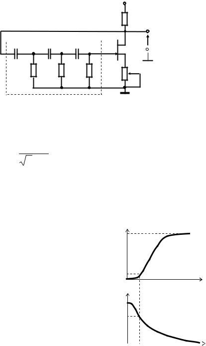 Электрическая схема автогенератора показана на рис. 14.9. Трехзвенная RC-цепь с одинаковыми элементами (выделена пунктиром) включена в петлю обратной связи инвертирующего усилителя. Как видно из графиков амплитудно-частотной и фазочастотной характеристик трехзвенной RC-цепи (рис. 14.10), на